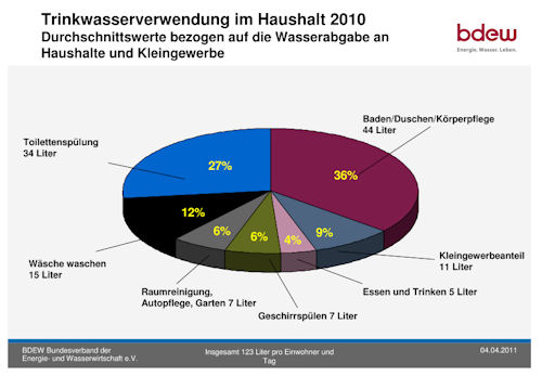 Eine Durchschnitts Deutscher verbraucht am Tag statistisch gesehen etwa 130 bis 160 Liter Wasser. Siehe auch unten stehendes Bild. In diesem Wasserverbrauch sind im Mittel 40 bis 50 Liter reines Warmwasser enthalten. Reines Warmwasser ist das Wasser, das in einer Heizanlage von ca. 10 Grad auf 50 Grad - somit also um ca. 40 Grad - erwärmt wird. Dieses reine Warmwasser - in der Regel in einem Speicher lagernd - wird dann mittels Kaltwasser auf Verbrauchstemperatur - ca. 38 bis 40 Grad - herunter gemischt, so dass es dann anschließend für den Verbraucher - als Verbrauchswarmwasser - nutzbar ist.
