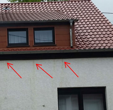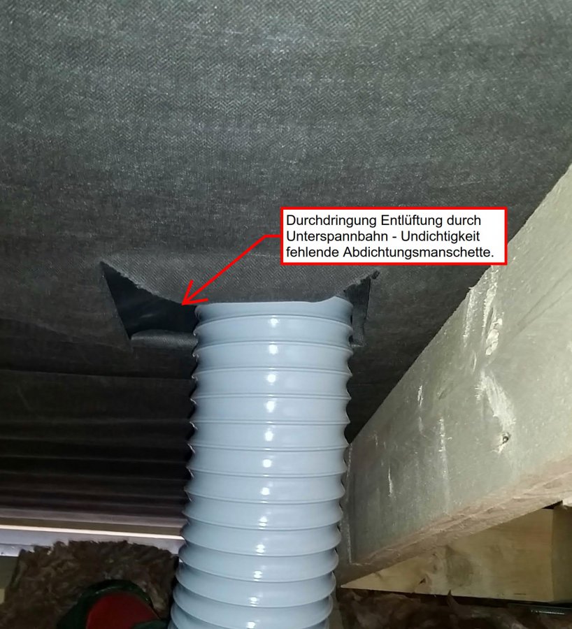 Unterspannbahn unterhalb der Dachhaut nicht ordnungsgemäß – ohne passende Manschette - abgedichtet. Hier kann von Wind untriebenes Wasser das über die Unterspannbahn zur Entwässerungsrinne geführt wird in den Dachraum eindringen und so zu einer Feuchtbelastung der Unterkonstruktion oder der horizontalen Wärmedämmebene führen. Folge Gefahr von Feuchte-/Schimmelschäden in der Wärmedämmebene.